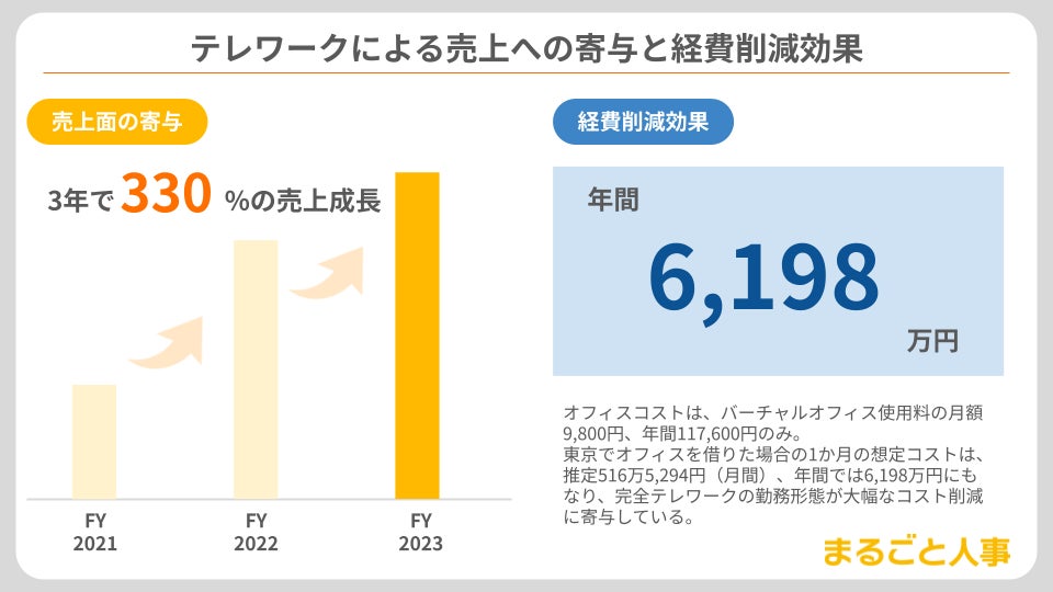 マルゴトでは、フルリモートでの事業運営により、「売上面での寄与」「経費削減効果」といった経営効果を実現しています。